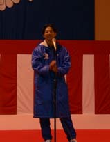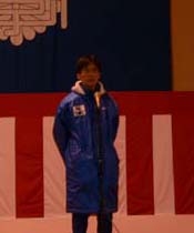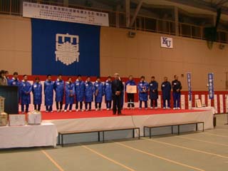 | 讃える会で挨拶する大川主将 | 讃える会で挨拶する6区・区間新の中澤選手 |