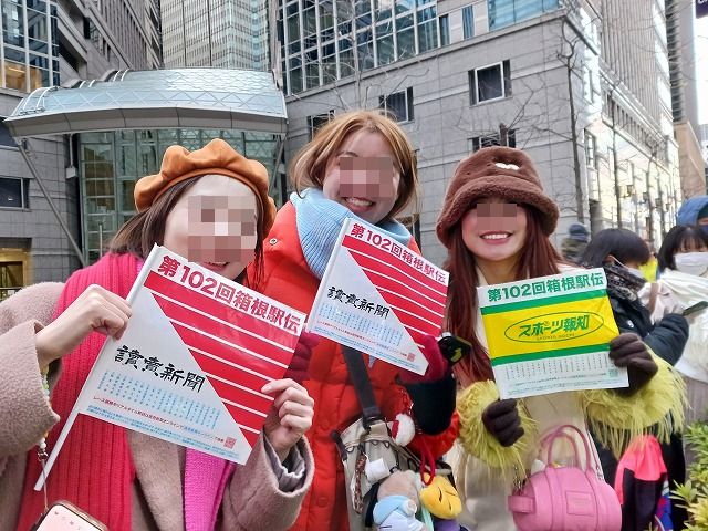 | スタート前、中国人の3人娘を記念撮影 一人がカタコトの日本語を話し、わざわざ上海から箱根駅伝を見るために昨日来日したと言う。 インターネットで動画を見たり情報を集めていたらしい。 日中がギクシャクしているのに、こんな人もいたなんて、ビックリ! |