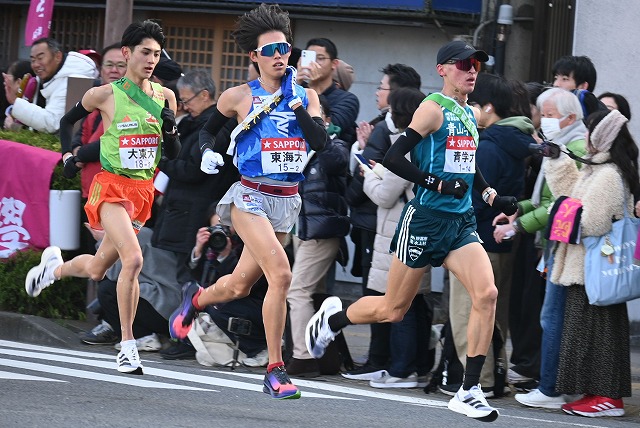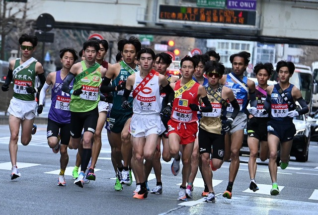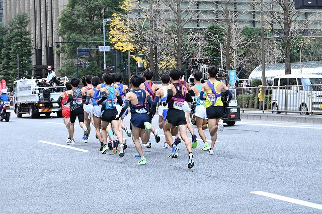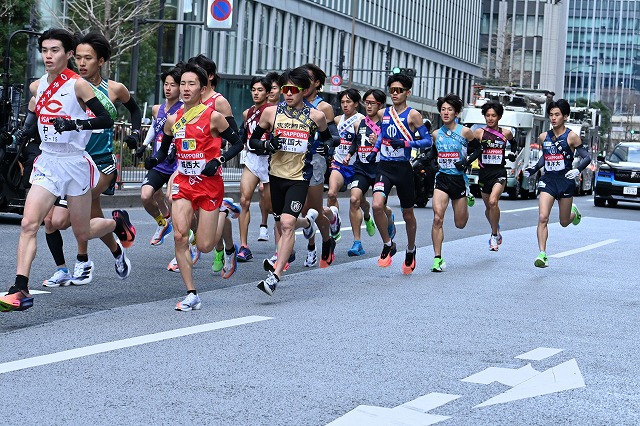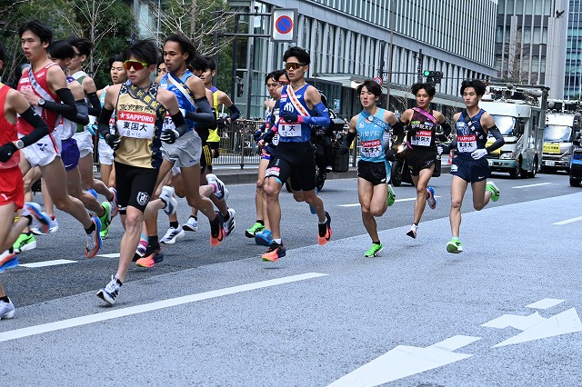 | 8:00:30 1区スタート直後 藤田(中大)・ 小河原(青学)・大濱(大東)・柴田(城西)・小柴(東国)・ 原(帝京)・黒木(創価)・酒井(神大)・池間(順大)・平八重(山学) 青木(國學院)・松井(東洋)ら |