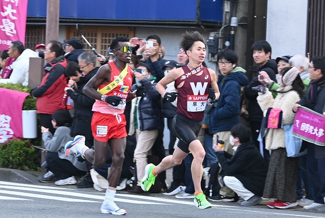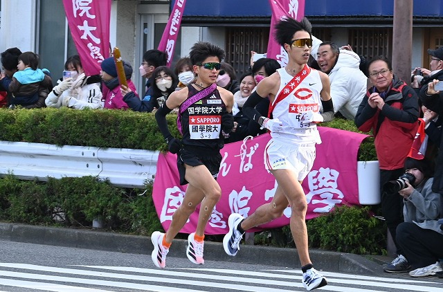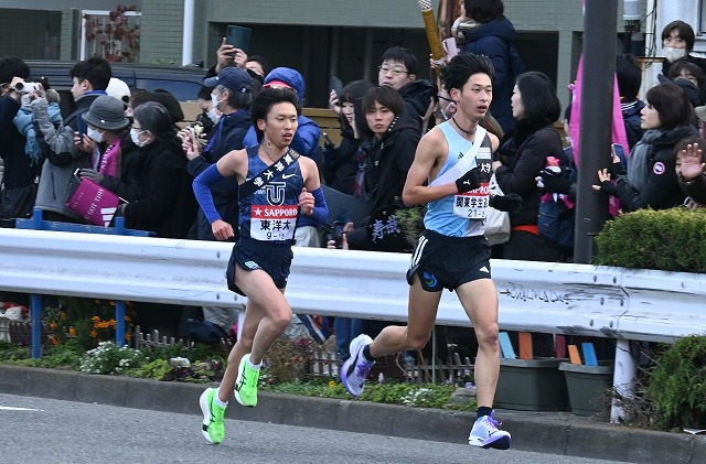 | 9:13:36 2区新子安駅前 トップと30秒差、7位通過、山口智(早大4:区間4位・通算3位)・ キムタイ(城西4:区間1位・通算1位) |