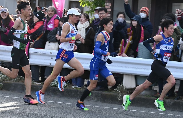 | 9:14:03 2区新子安駅前 トップと47秒差、9位集団、宮本(神大4:区間13位・通算14位)・ 吉岡(順大3:区間9位・通算8位)・田島(日体4:区間14位・通算13位)・ 前田(東農3;区間11位・通算10位) |
